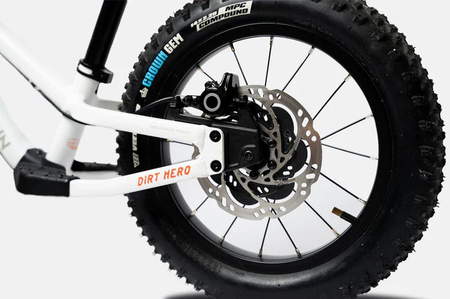 Der Dirt Hero ist mit 12-Zoll- und 14-Zoll-Radgrößen kompatibel und wächst mit deinem kleinen Shredder mit.