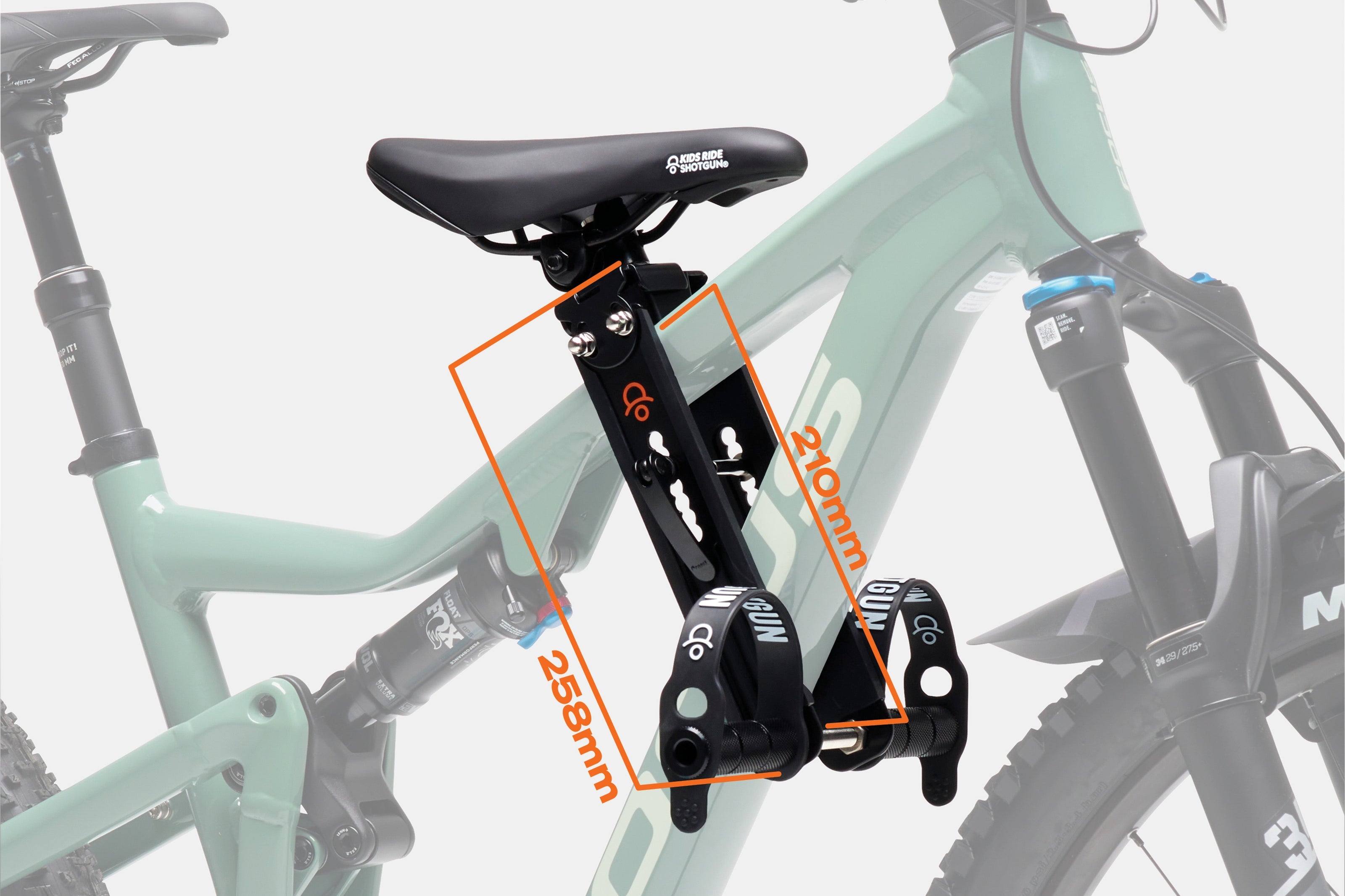 Der Shotgun 2.0-Sitz hat einen Einstellbereich, um auf Oberrohre von 30 bis 68 mm Breite und Unterrohre von 30 bis 100 mm Breite zu passen. Wir haben keine analogen Mountainbikes gefunden, die außerhalb dieser Spezifikationen liegen. Der Shotgun Sitz passt über das Oberrohr und wird unter dem Unterrohr befestigt. Der maximale Abstand zwischen dem Oberrohr und dem Unterrohr deines Fahrrads, an dem der Shotgun-Sitz montiert wird, darf 210 mm nicht überschreiten.