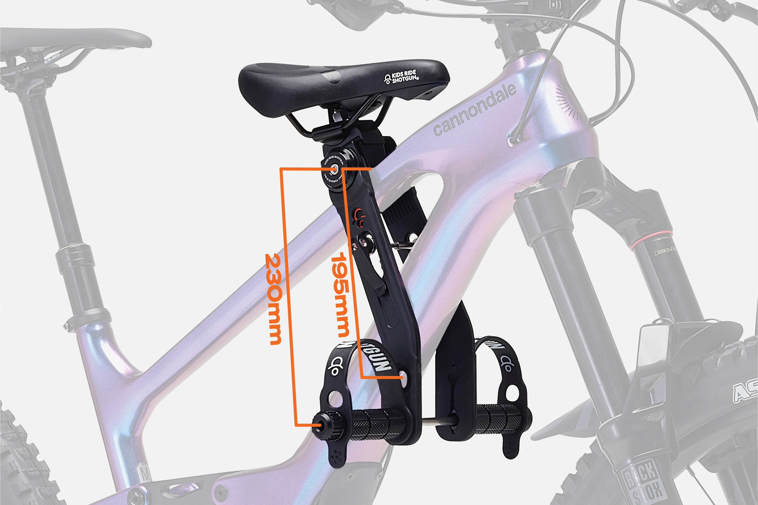 Der Shotgun 2.0-Sitz hat einen Einstellbereich, um auf Oberrohre von 30 bis 68 mm Breite und Unterrohre von 30 bis 100 mm Breite zu passen. Wir haben keine analogen Mountainbikes gefunden, die außerhalb dieser Spezifikationen liegen. Der Shotgun Sitz passt über das Oberrohr und wird unter dem Unterrohr befestigt. Der maximale Abstand zwischen Oberrohr und Unterrohr deines Fahrrads, an dem der Shotgun Sitz montiert wird, darf nicht mehr als 195 mm betragen, wenn die obere Achsposition verwendet wird, oder 230 mm, wenn die untere Achsposition verwendet wird.
