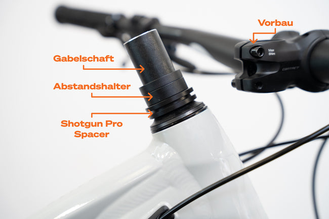 Der Shotgun Pro Abstandshalter ist 10 mm hoch, daher benötigst du 10 mm Platz unter deinem Vorbau, um den Abstandshalter unterzubringen. Wenn du unter deinem Vorbau keinen Platz hast, aber überschüssige Abstandshalter oben auf deinem Vorbau hast, kannst du diese möglicherweise neu positionieren, um die Höhe deines Vorbaus zu erhöhen. Dadurch kann unter dem Vorbau der erforderliche Platz für die Montage des Shotgun Pro Abstandshalters geschaffen werden.